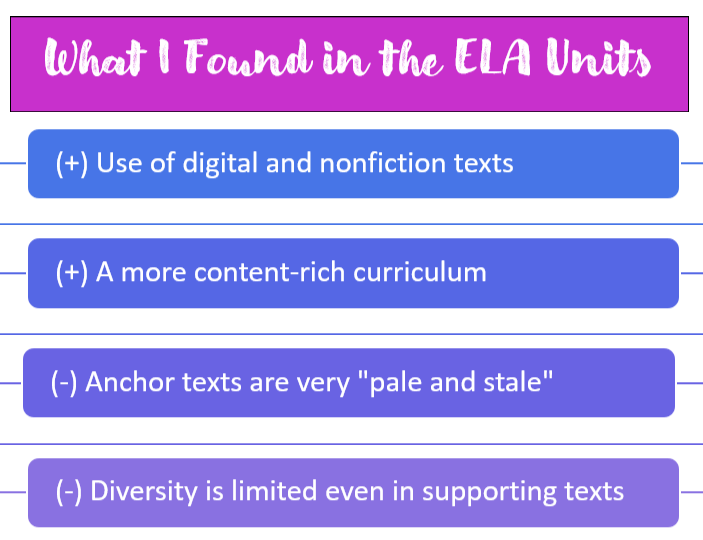 I collected information on more than 300 texts in multimodal English Language Arts units. For each text, I identified the genre, medium, and publication date, as well as demographic details about the author (e.g., race, gender). Four of the insights that emerged from this information are listed in the image on the left.