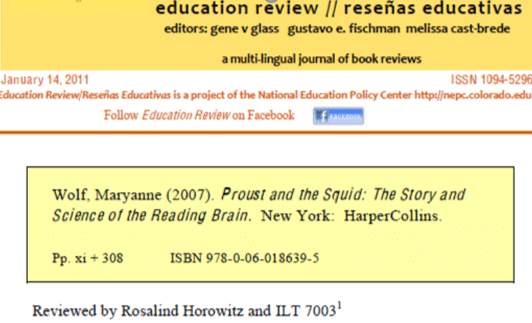 ILT 7003 emphasized interdisciplinary projects with connections to Language and Literacy. For one major assignment in this course, I read Proust and the Squid: The Story and Science of the Reading Brain (Wolf, 2007) and worked with peers to write a formal book review (see image). For another major assignment, I researched and wrote about the Center for the Interdisciplinary Study of Language and Literacy.
